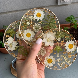 Real Pressed Flower Coaster Set, Handmade Resin Floral Coasters with Gold Flakes, Botanical Gift for Her, Nature Inspired Drink Decor